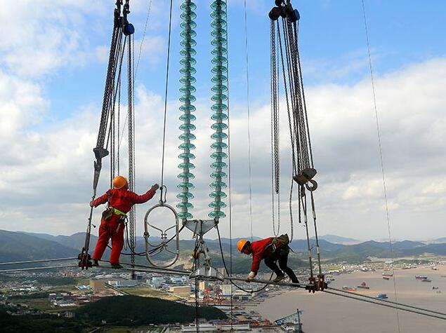 11月7日,隨著最后一相導(dǎo)線完成掛線,浙江舟山本島與岱山島聯(lián)網(wǎng)重點工程——220千伏岱山輸電線路改造工程灌門大跨越架線施工結(jié)束。本次改造完成后,輸電能力將提升1.5倍。